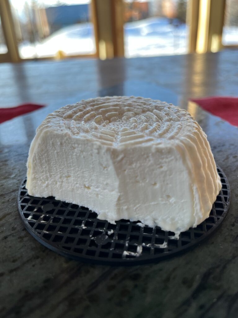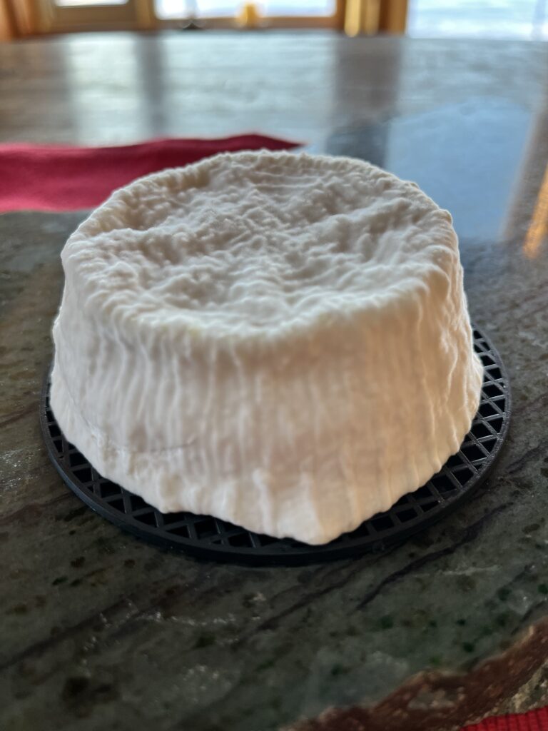 市販の低脂肪牛乳で作ったものはジオトリカムのカビは生えそろっていませんが、表面には薄い皮があるようです。また熱変性したタンパク質やカゼイン複合体がどんな食感になるのか心配でしたが、硫黄臭や加熱臭、ざらつきも感じることがなく美味しくできていました。若干ホエーが残っているようで酸味を少し感じるくらいでした。