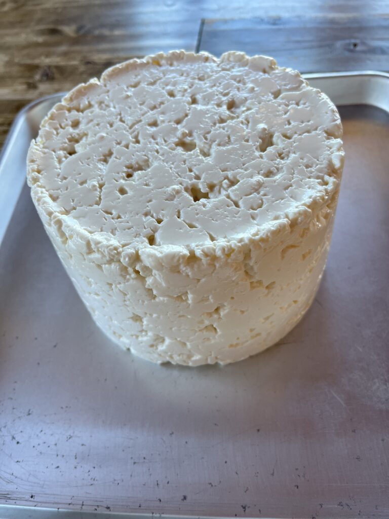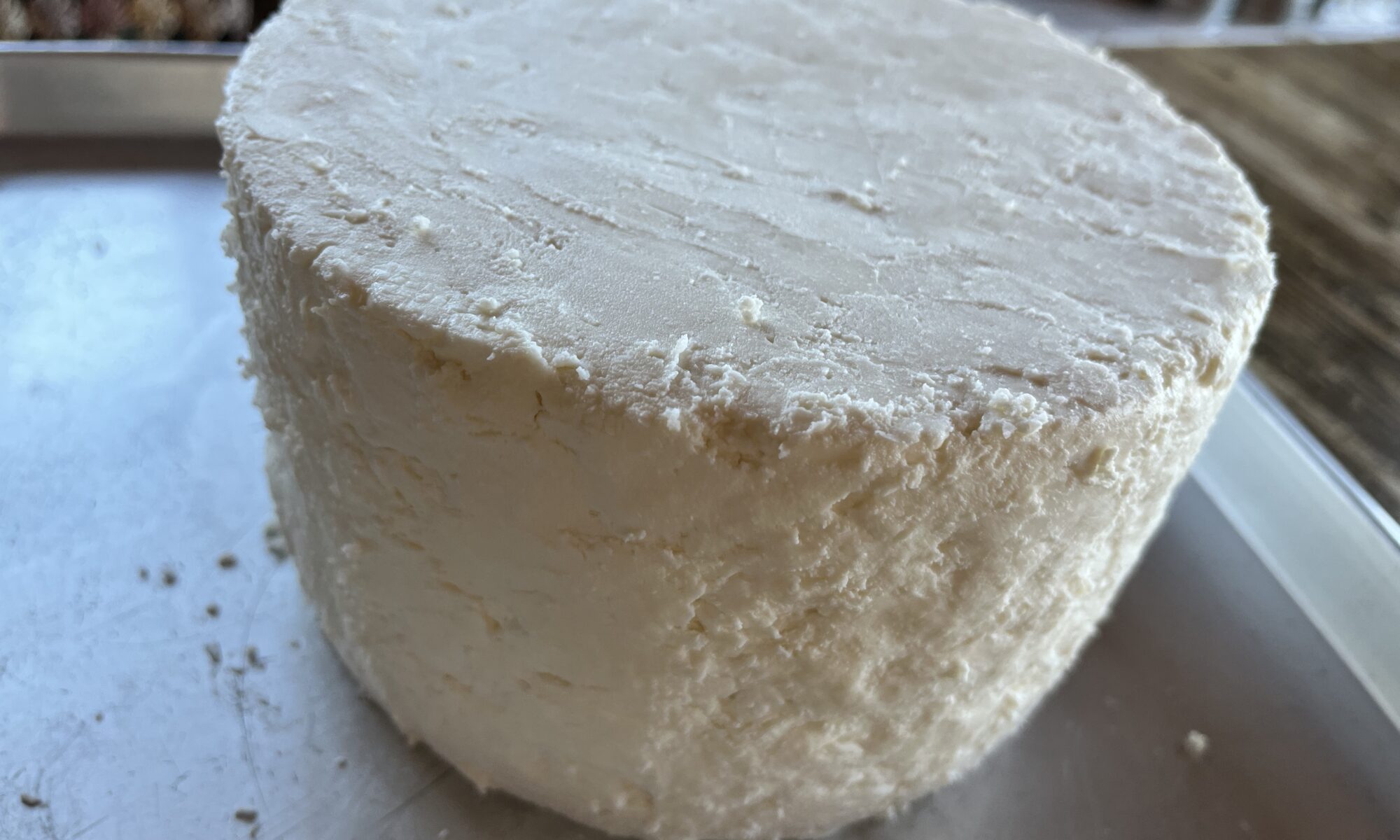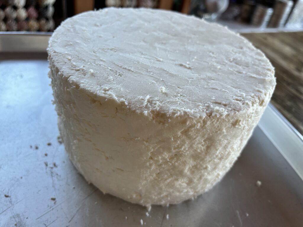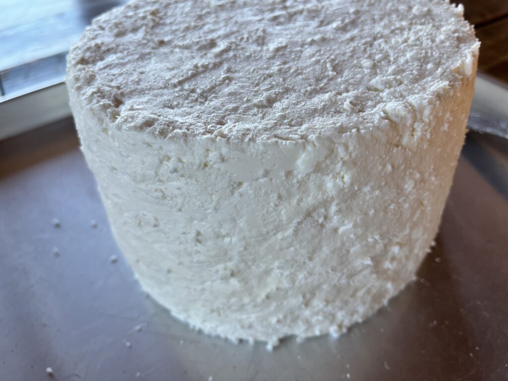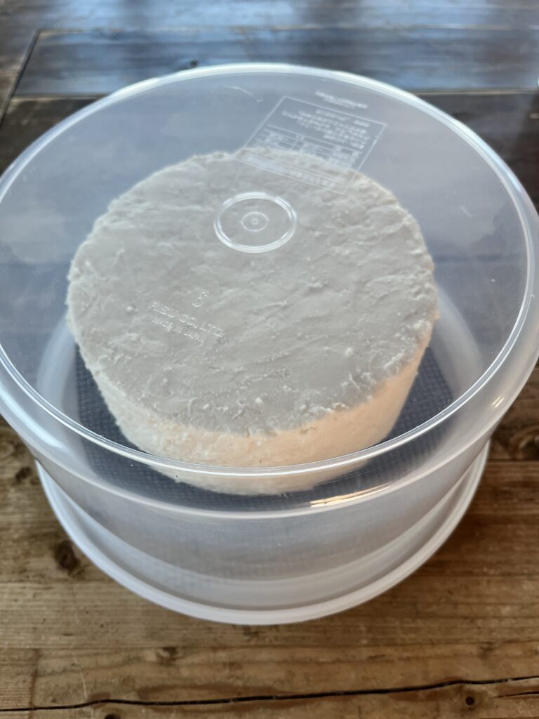 昨日製造したスティルトン風チーズ。脱型( pH5.3 )後にパレットナイフで表面を薄く削って穴の部分を埋めながら表面整形を行い、ケースに入れ湿度を保ちワインセラーで熟成に入りました。表面にどのようなカビが出てくるか楽しみです。