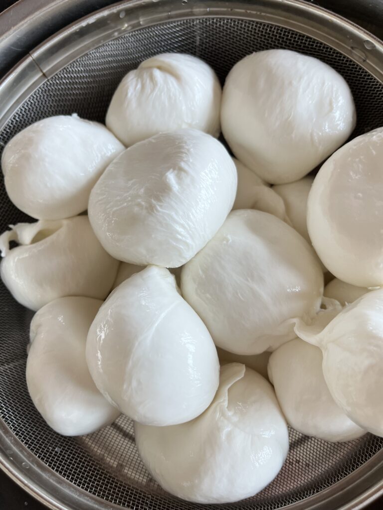 この後、モッツアレラチーズ 、ストリングチーズ、ブラータ、チーズ餅(クランベリー、カシュナッツ、ピスタチオ入りモッツアレラ)の作成を行いました。